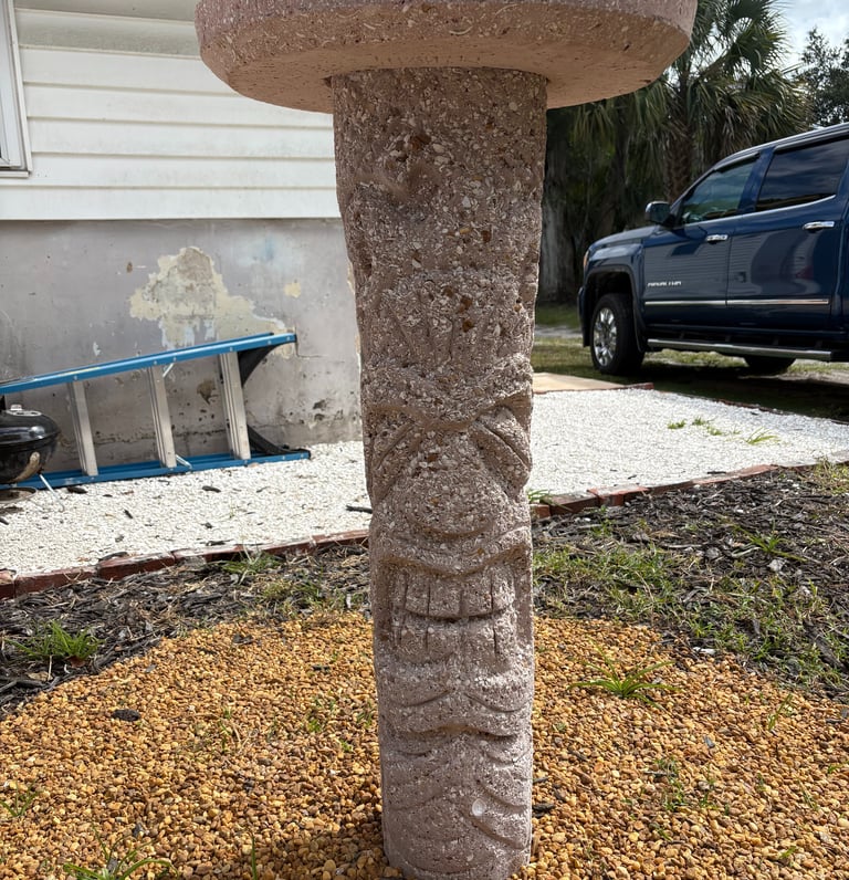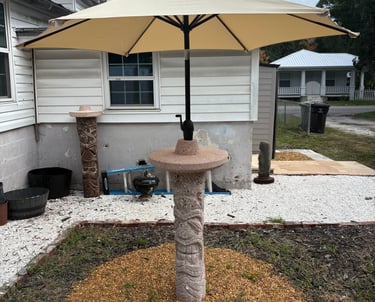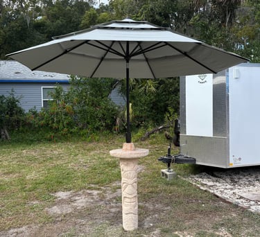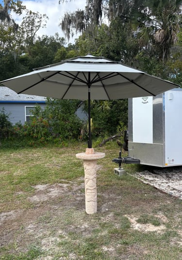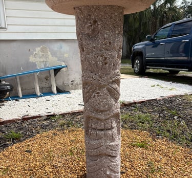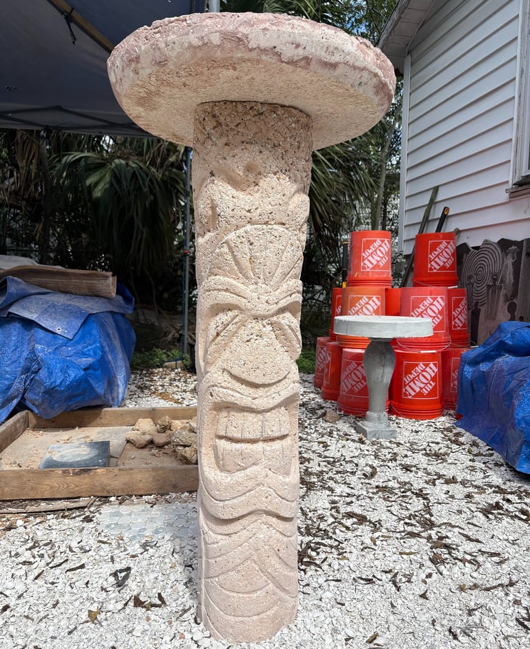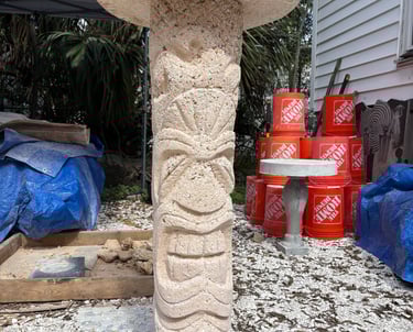 What started as a simple concrete tiki evolved through experimentation and obsession. We swapped traditional aggregates for 100% crushed coquina rock, refining every batch until we achieved a material that looks and feels like true coquina — not imitation, but evolution. Each tiki is precast in durable rubber molds, allowing subtle variations that make no two pieces identical. The result: a natural coral-shell finish with unbeatable durability and unmistakable coastal texture.