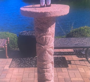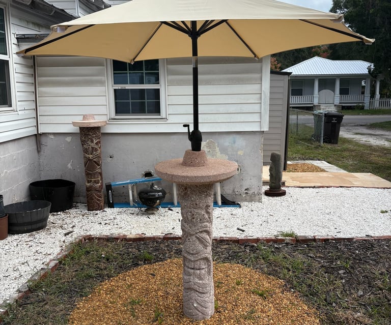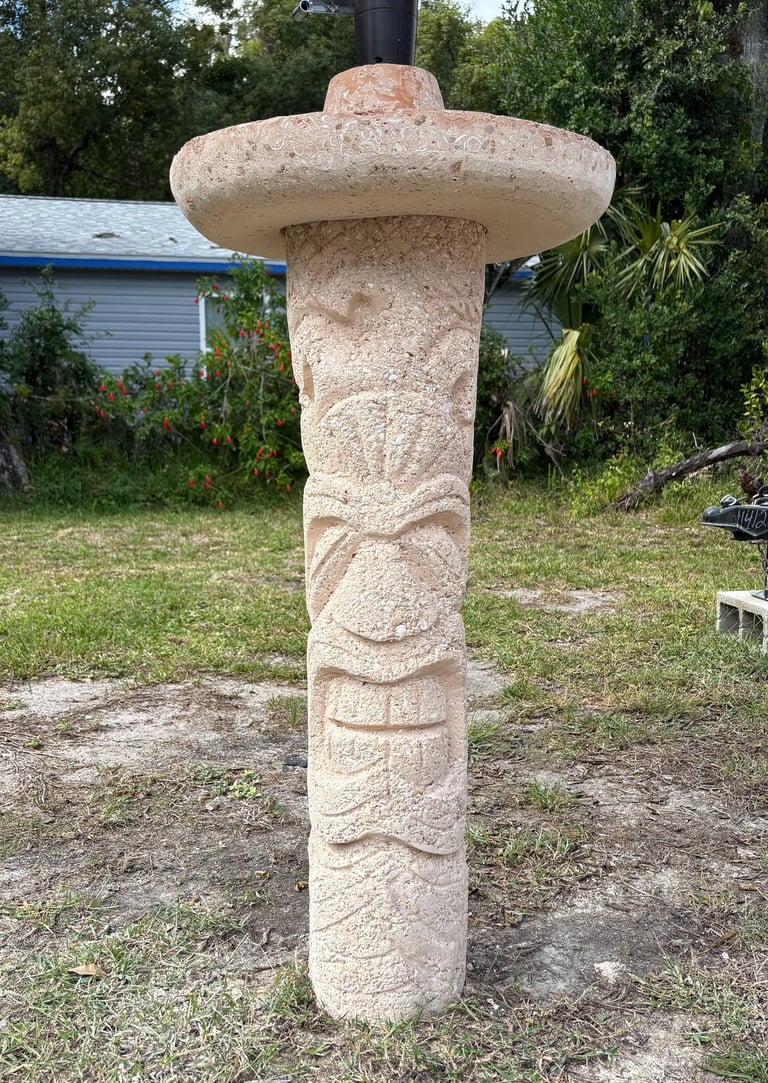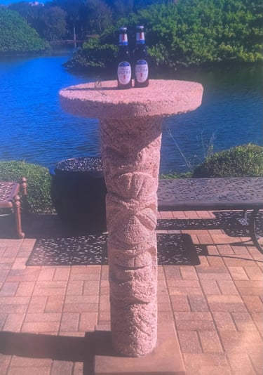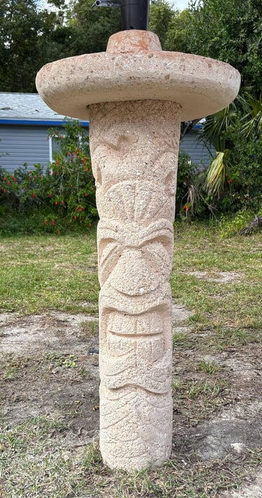 These high-top tiki stands combine artistry and engineering. Their coarse, shell-textured surfaces contrast beautifully against smooth concrete, capturing the authentic feel of old Florida architecture. Each piece celebrates the rugged beauty of coquina stone, reimagined through modern craftsmanship.